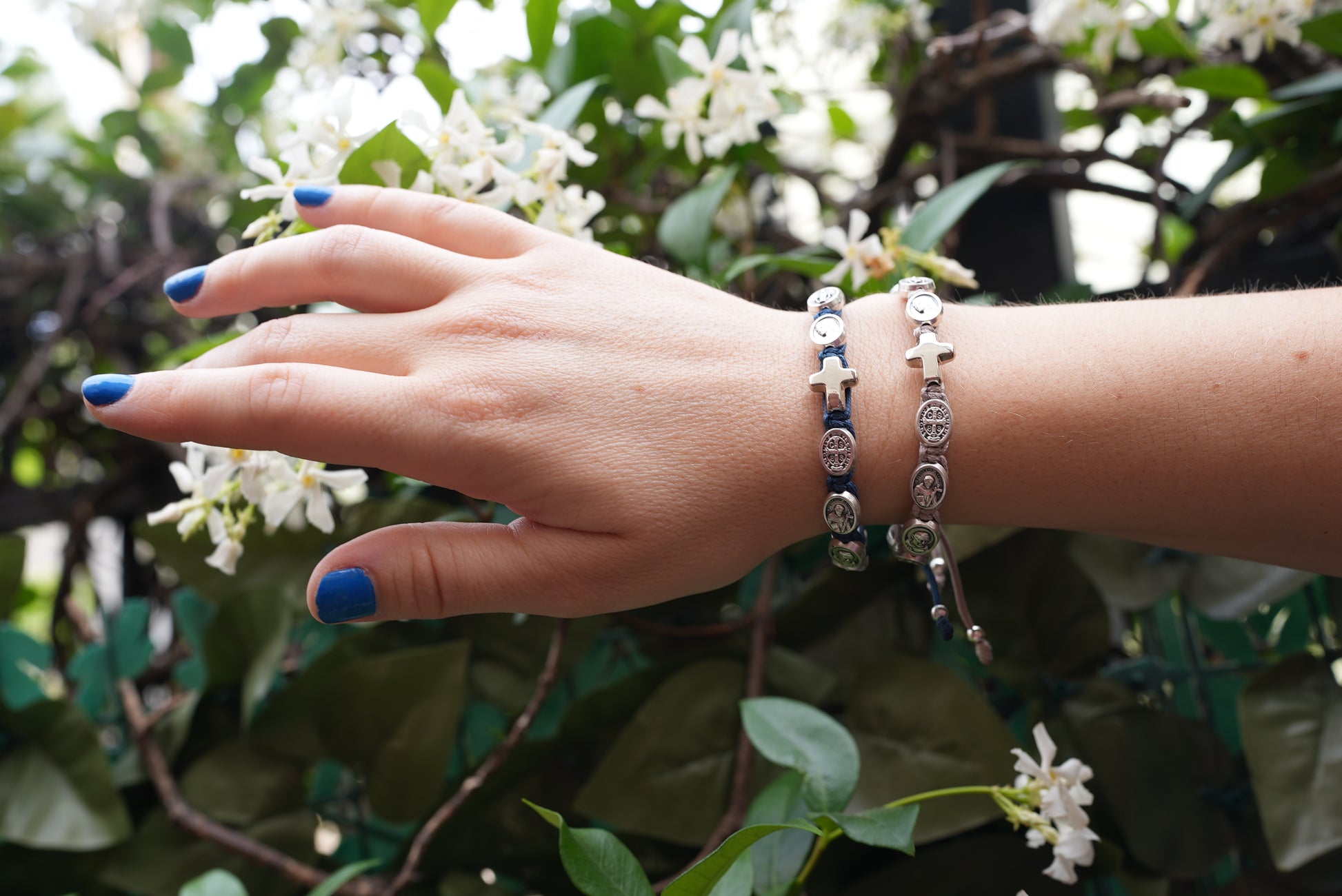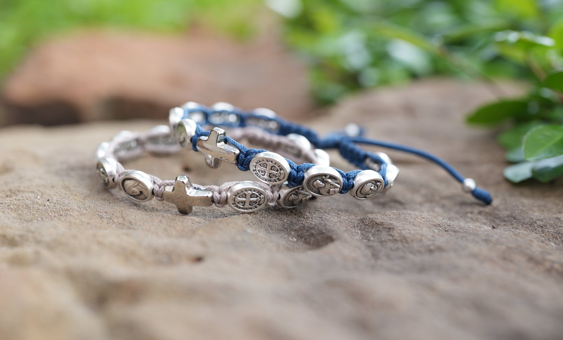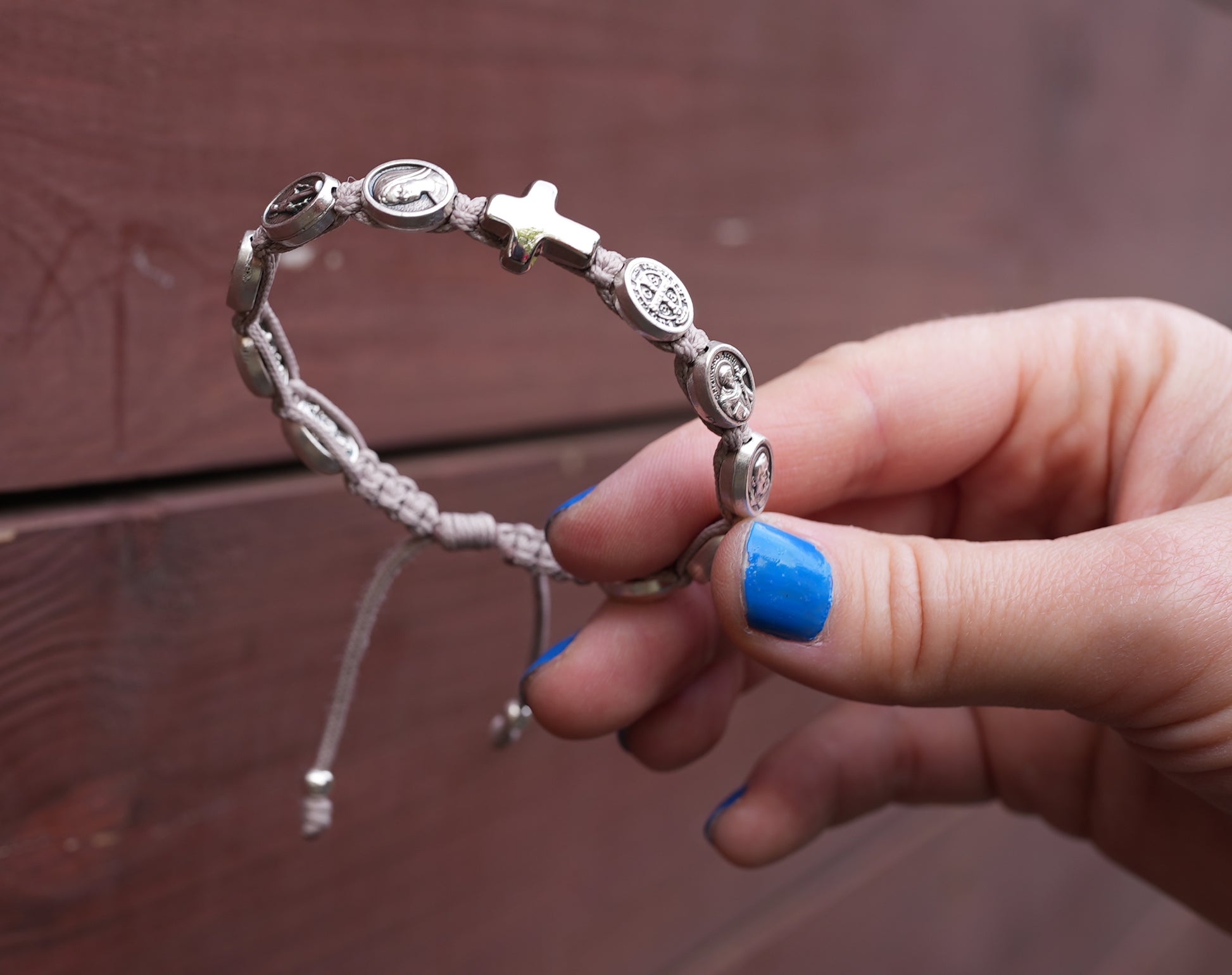 The cord of this bracelet is tied with a sliding slipknot that can be adjusted to a wide range of sizes with silver medals that are approximately 1/3-inch.