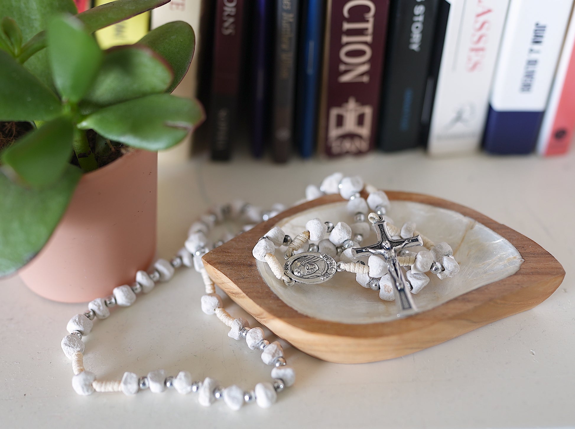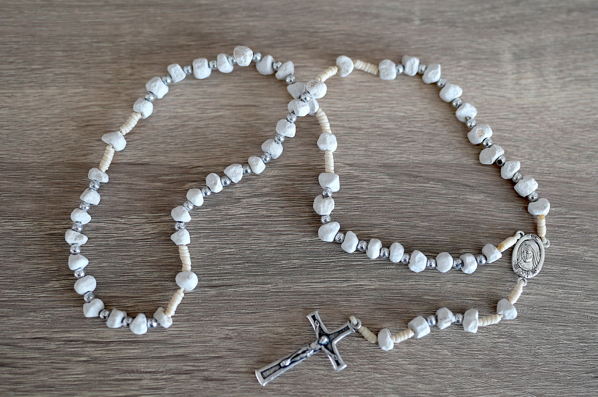 This rosary is handmade with rocks from Medjugorje. It calls to mind the rocky climb up Apparition Hill and Cross Mountain.